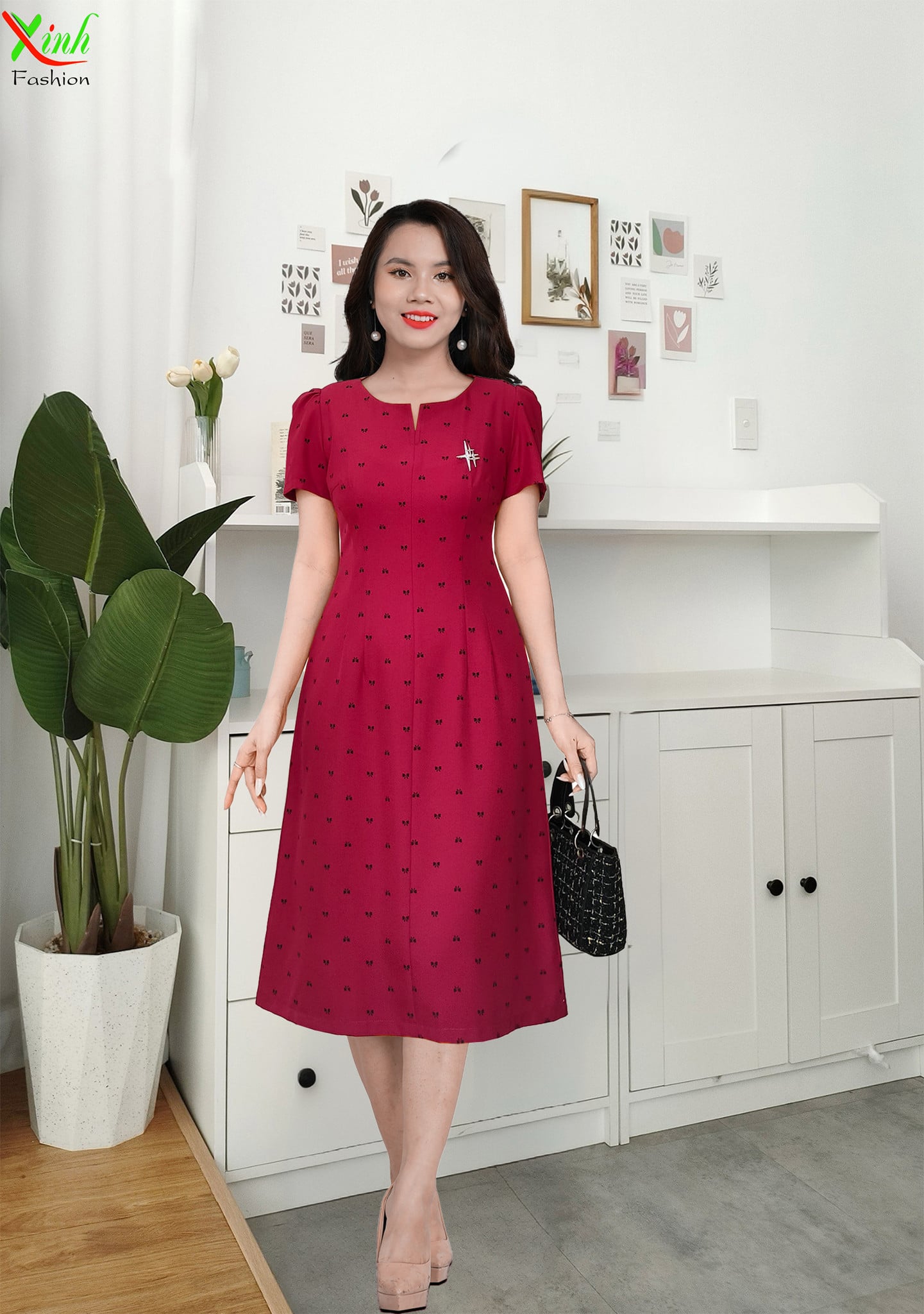 Thiết kế với hoạ tiết hình nơ nhí cùng tôn màu đỏ đô thanh lịch, năng động, vừa gần gũi và đơn giản sẽ đem đến vẻ ngoài thanh lịch và tinh tế cho phái đẹp. Hơn nữa tông màu này còn là lựa chọn tuyệt vời cho việc tôn vinh làn da người phụ nữ.