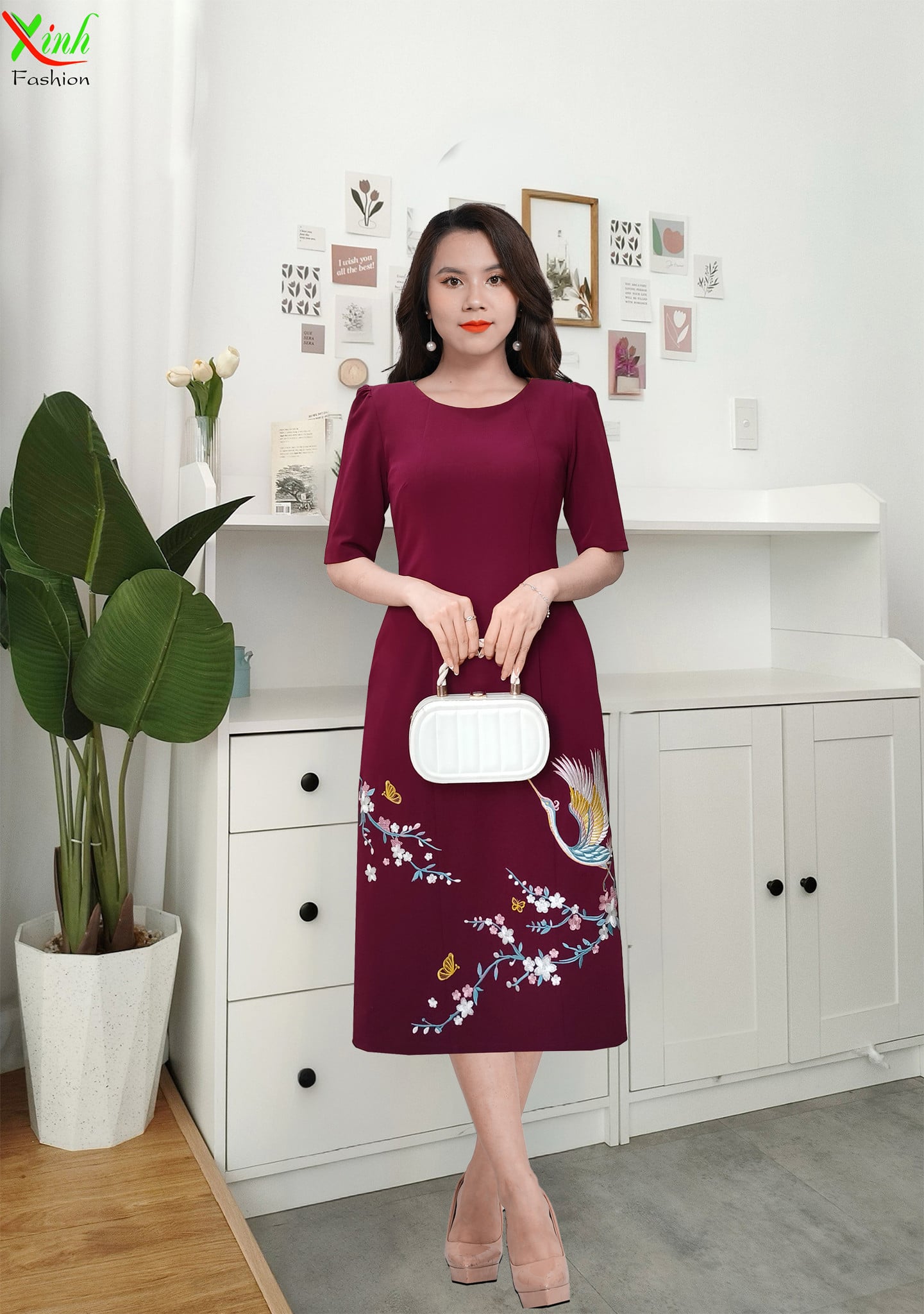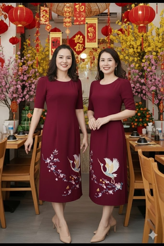 Điểm nhấn là họa tiết hoa thêu thoạt nhìn thì rất đơn giản, nhưng đòi hỏi sự chỉnh chu, tỉ mỉ trong từng đường kim, mũi chỉ. Tông màu đỏ mận sang trọng kết hợp họa tiết thêu chim hạc và hoa mai mềm mại, mang ý nghĩa phú quý – may mắn – thịnh vượng.