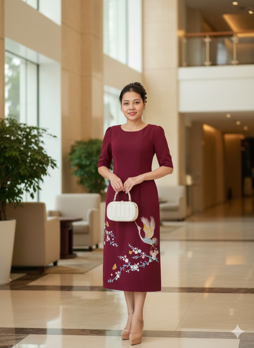 Thiết kế đầm trung niên cao cấp dành cho phụ nữ Việt Nam yêu thích phong cách thanh lịch và tinh tế. Đầm dáng suông nhẹ, độ dài qua gối giúp che khuyết điểm hiệu quả, tôn dáng tự nhiên và mang lại cảm giác thoải mái khi mặc.
