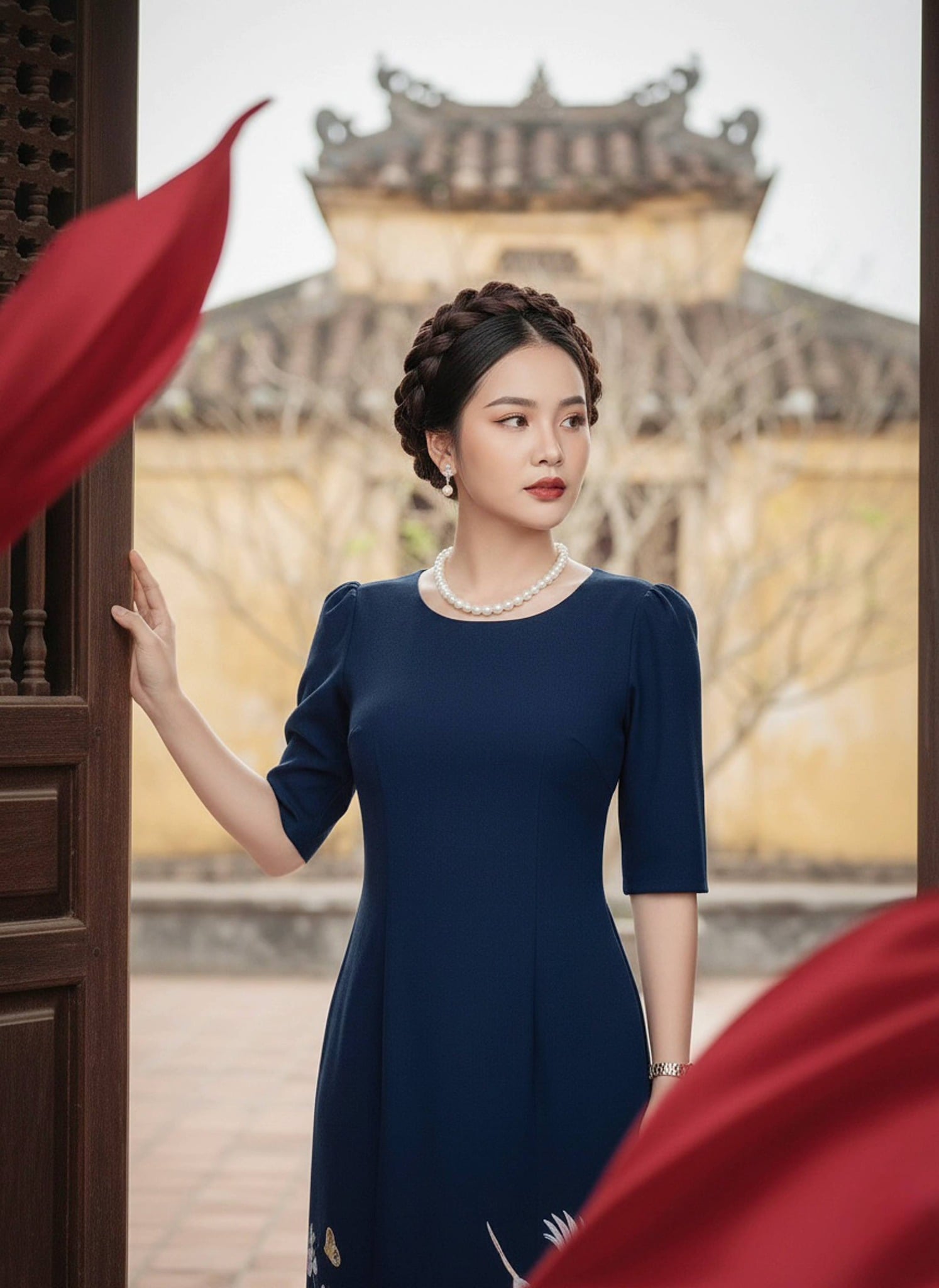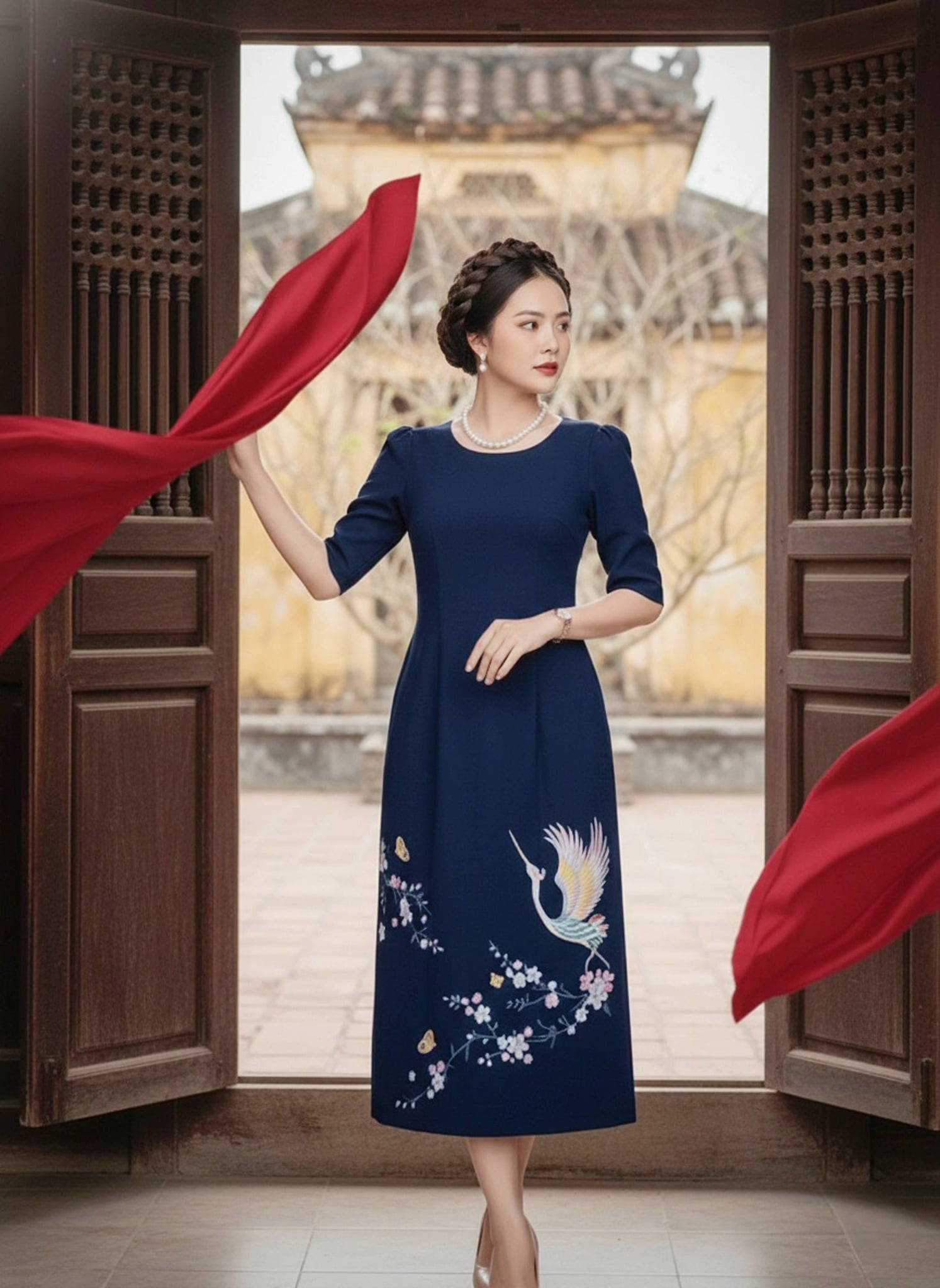 Điểm nhấn là họa tiết hoa thêu thoạt nhìn thì rất đơn giản, nhưng đòi hỏi sự chỉnh chu, tỉ mỉ trong từng đường kim, mũi chỉ. Tông màu xanh than tối giản kết hợp họa tiết thêu chim hạc và hoa mai mềm mại, mang ý nghĩa phú quý – may mắn – thịnh vượng.